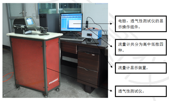 工作原理:當(dāng)試樣正反兩面達(dá)到規(guī)定的壓差時(shí),測(cè)試單位時(shí)間內(nèi)垂直流過試樣一定面積的氣流流量。