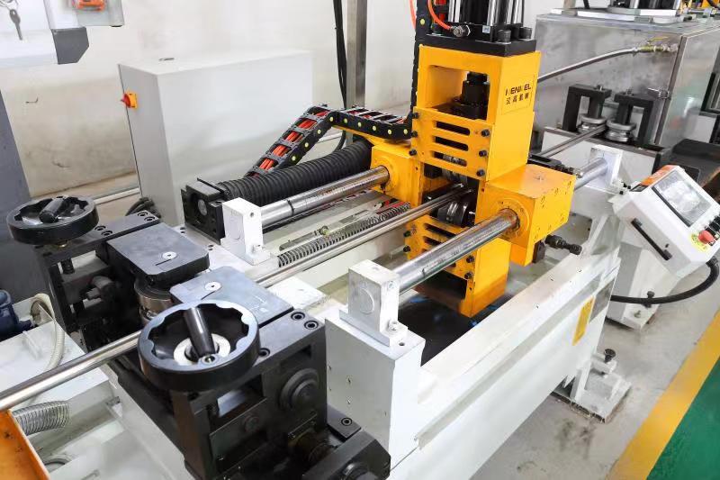 內(nèi)碾壓裝置,由液壓系統(tǒng)和碾壓小車組成。碾壓小車有上下兩輥輪和放在管子內(nèi)的芯棒程序動(dòng)作做往復(fù)運(yùn)動(dòng),整個(gè)系統(tǒng)由PLC程序控制。將焊接后不銹鋼管的內(nèi)焊縫碾平,采用業(yè)內(nèi)創(chuàng)新性的兩缸技術(shù),保證小車運(yùn)行平穩(wěn),小車換向采用動(dòng)態(tài)曲線設(shè)置,觸摸屏控制。基于雙推型焊縫整平功能,研發(fā)出高速型整平機(jī),更快速,更高效。